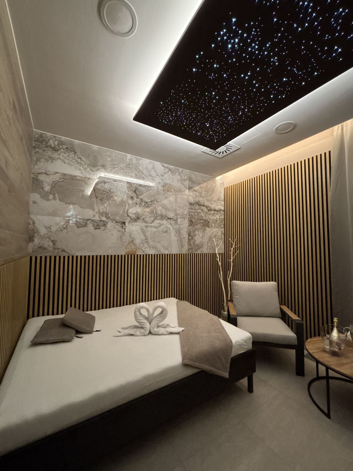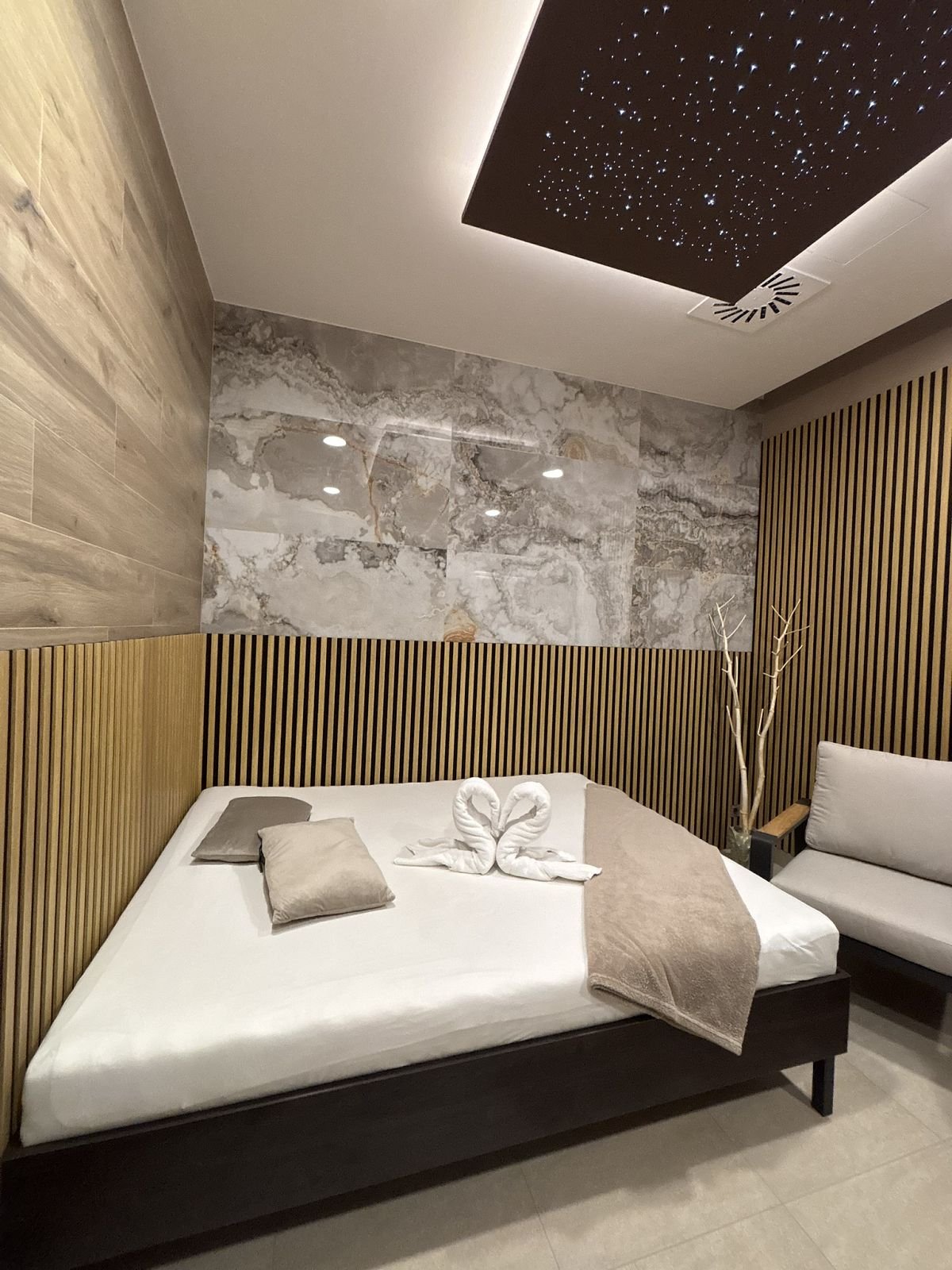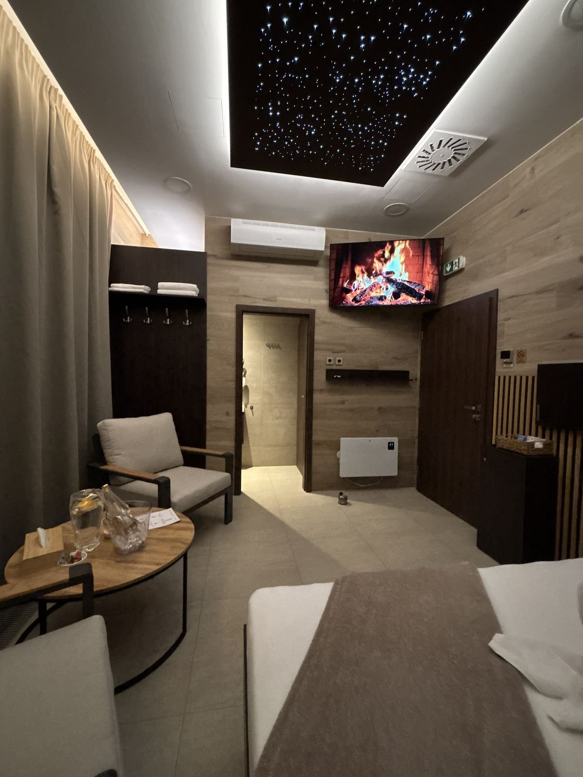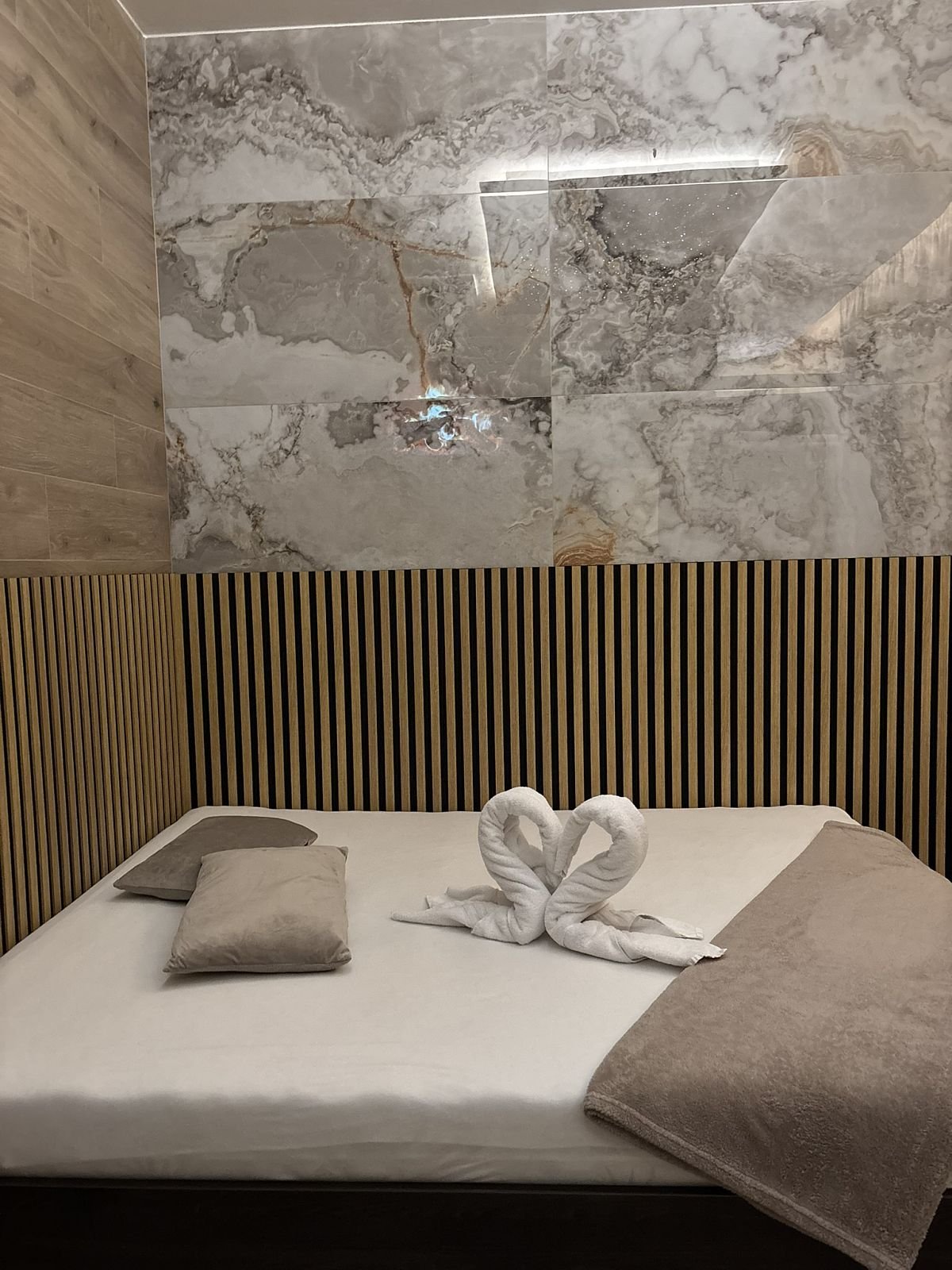Vybavení: Relaxační lůžko 160 × 200, pohodlné posezení, sprcha, WC, fén, televize, diskrétní box a interní telefon – vše připravené tak, abyste měli maximální komfort a naprosté soukromí.
