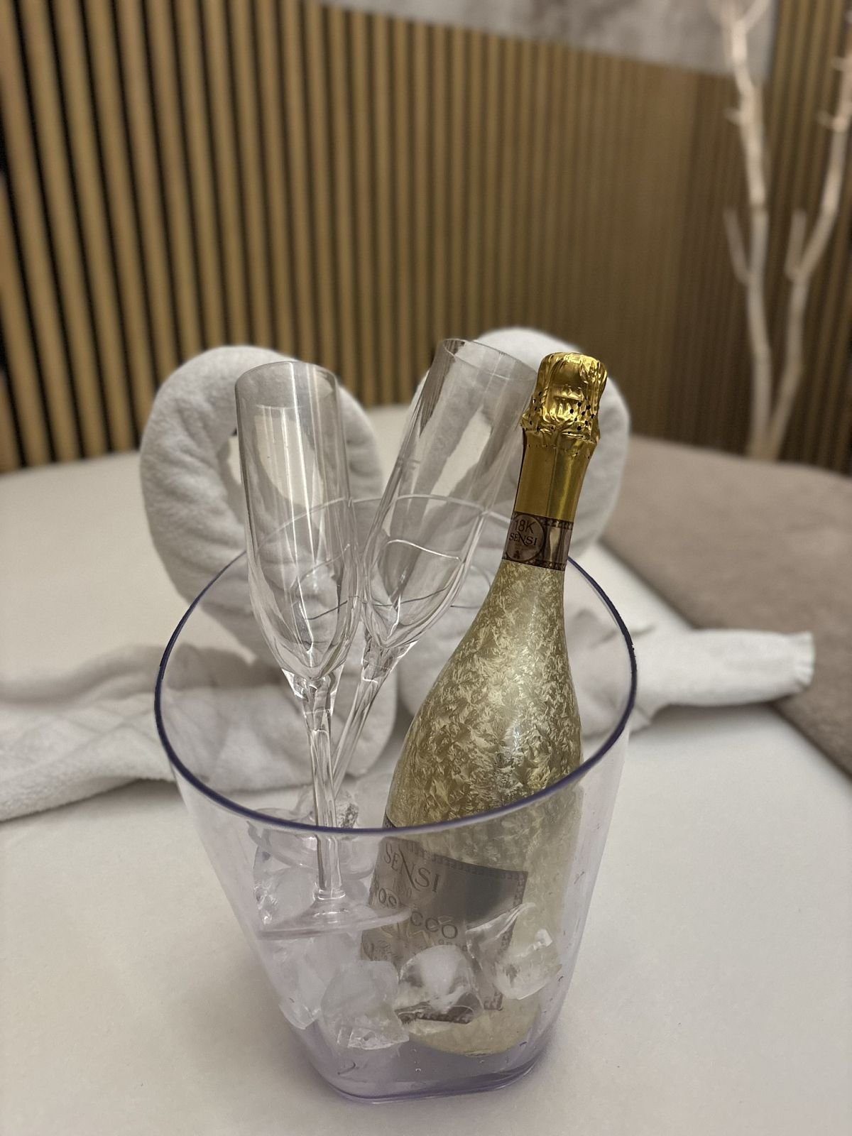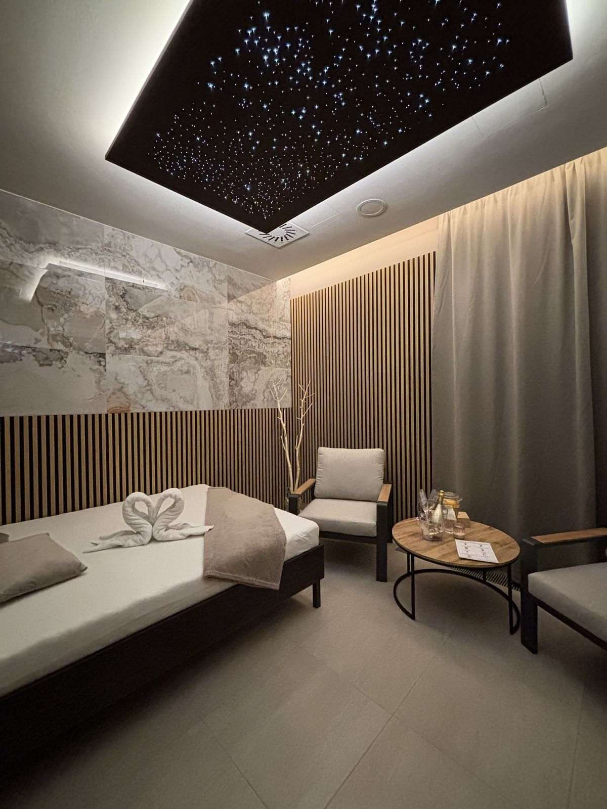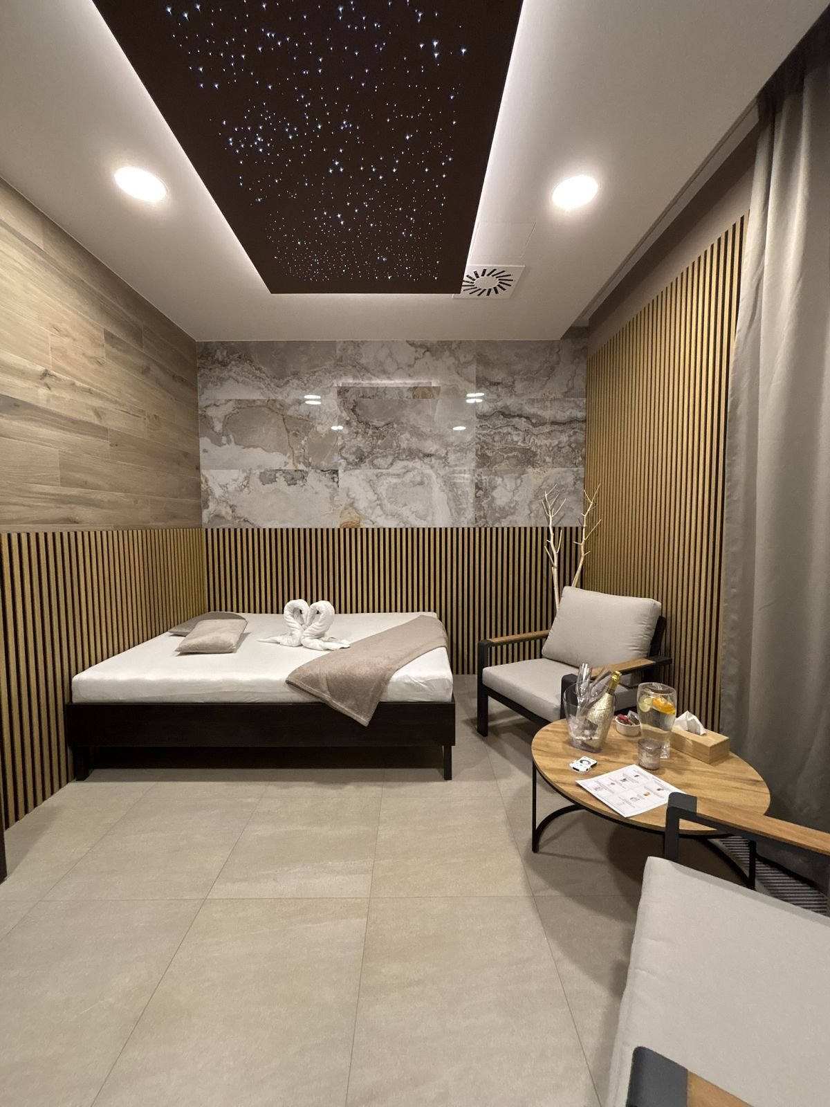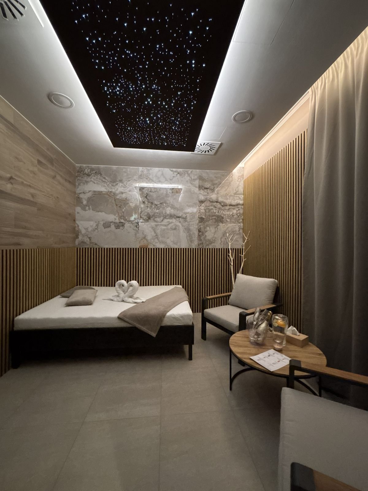 Vybavení: Relaxační lůžko 160 × 200, pohodlné posezení, sprcha, WC, fén, televize, diskrétní box a interní telefon – vše připravené tak, abyste měli maximální komfort a naprosté soukromí.